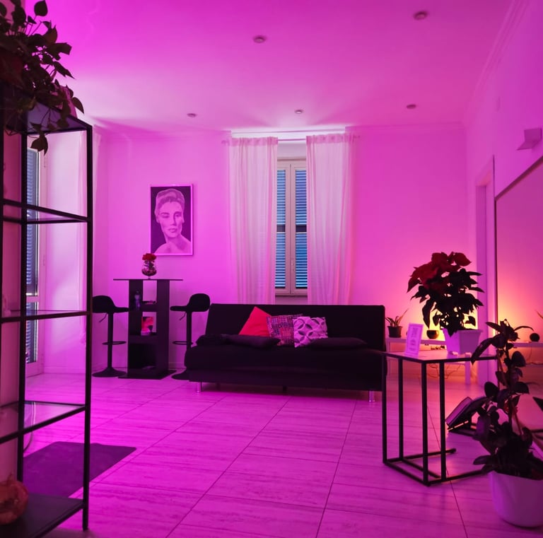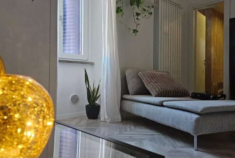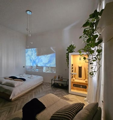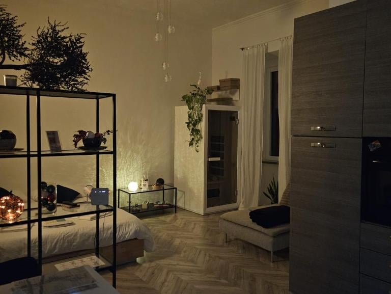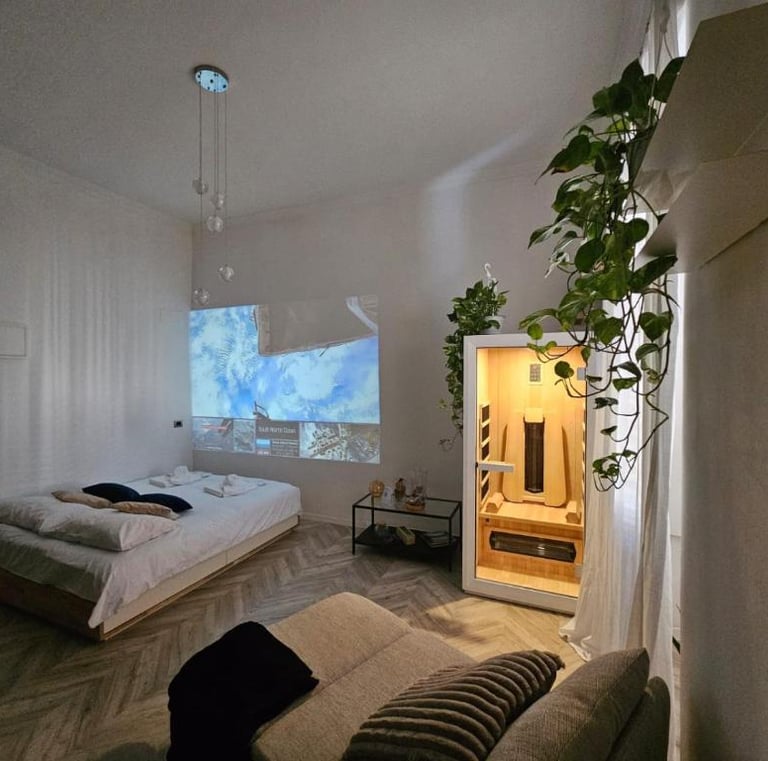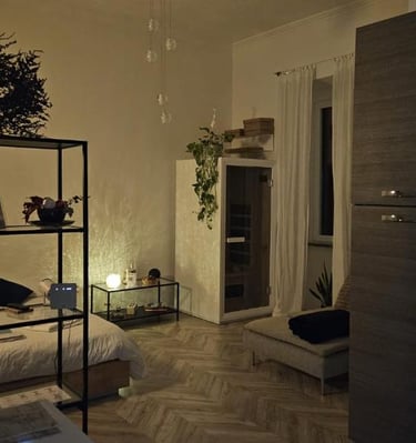 Nel monolocale di 35mq, dal design unico e moderno, troverete una sauna per il vostro esclusivo utilizzo, un'area wellness dove rilassarsi con una tisana o gustando un buon calice: magari ascoltando la nostra playlist... Il nostro bagno ospita una rilassante doccia con tutti i confort. L'appartamento è arredato con sauna e lampade d'atmosfera che permettono di godersi un po' di relax. Diversi dispositivi di aromaterapia con olii essenziali e led per la cromoterapia favoriscono a creare un'atmosfera unica per il tuo soggiorno. La nostra breakfast area è dotata di tutti i servizi necessari per godersi una buona colazione con macchina per il caffè, forno e cucina completa. Tutto ciò di cui hai bisogno per un week-end all'insegna del benessere!